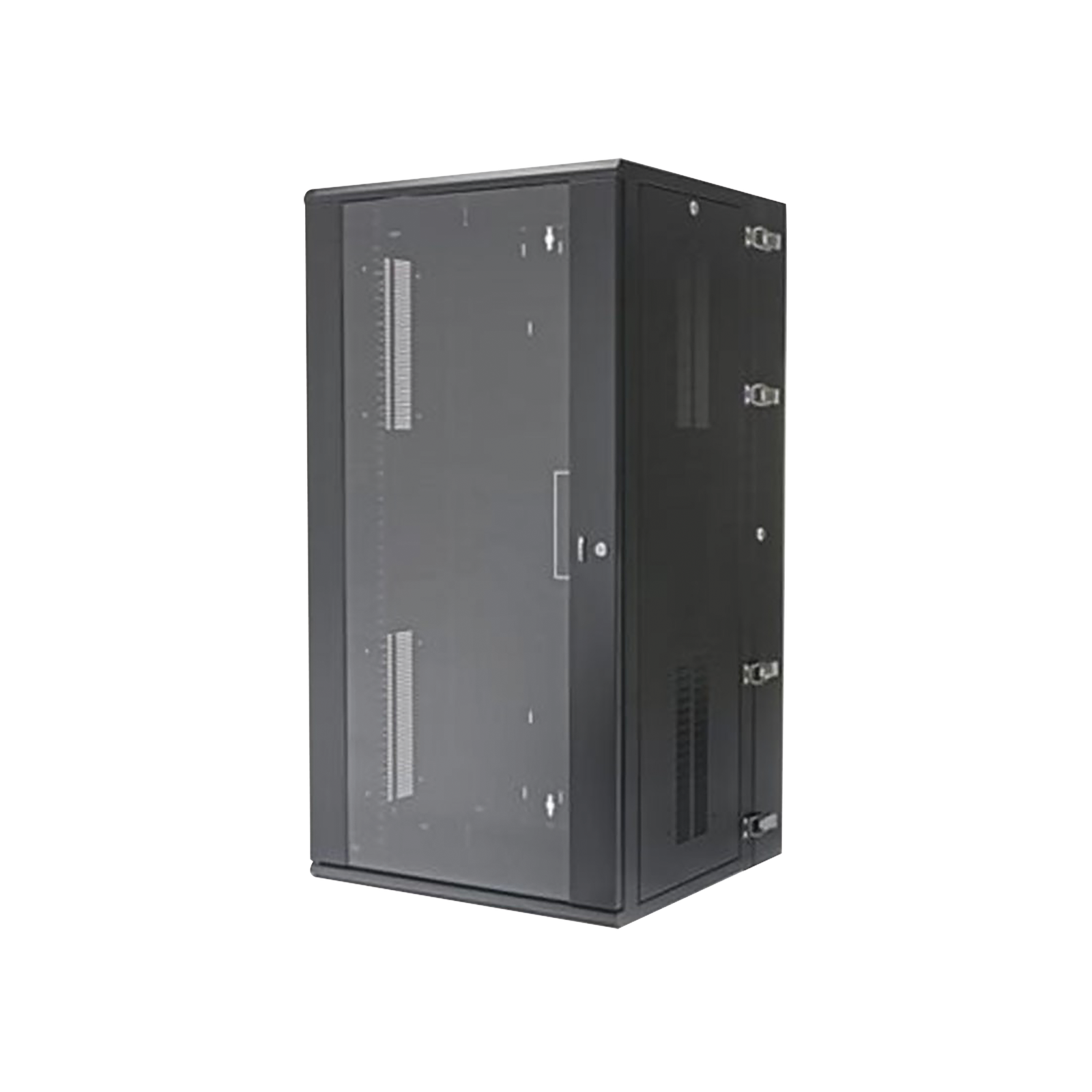 Gabinete de montaje en pared construido en acero, soporta 26 unidades de Rack para equipos de red activos o pasivos. Cuenta con paneles laterales totalmente desmontables y esta diseñado para permitir el control de clima adecuado para uso con diversos equipos de red, así como Switches de alimentación remota (PoE) y fuentes de alimentación ininterrumpida (UPS).